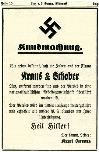 Bis Ende 1938 werden in Linz, wo der Schwerpunkt der oberösterreichischen jüdischen Betriebe liegt, 32 Handelsbetriebe arisiert, 31 liquidiert, sieben Betriebe durch die Gestapo enteignet, bei vier Betrieben ein Konkurs eingeleitet und zwei Betriebe unter kommissarische Leitung gestellt.