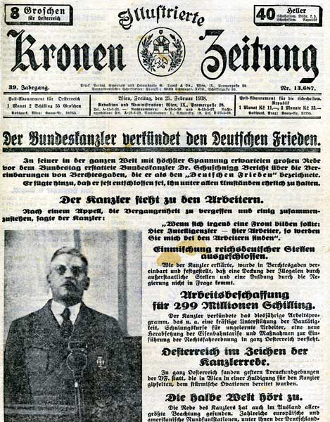 Foto rechts oben: Titelseite "Kronen Zeitung" vom 25. 02.1938,