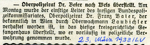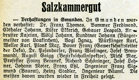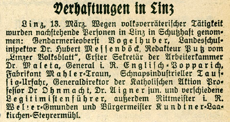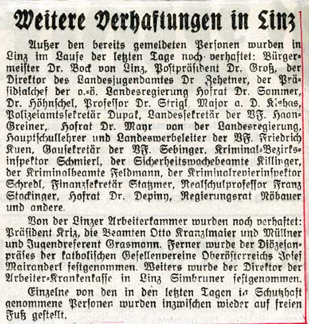 Unmittelbar nach der Machtübernahme werden die wichtigen politischen Funktionen mit Nationalsozialisten besetzt. SS-Sturmbannführer Dr. Mildner, der stellvertretende Leiter der Staatspolizeistelle Linz, gibt am 15. März die Anweisung bei "der Auswahl der in Schutzhaft zu nehmenden Personen nicht kleinlich vorzugehen". Die verhafteten Personen beschuldigt man willkürlich des Volksverrates und der Unterschlagung. Auch Landeshauptmann Dr. Heinrich Gleißner wird am 15.März in Schutzhaft genommen.