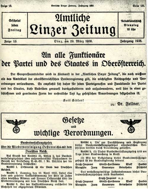 Rechts unten: Gesetze und wichtige Verordnungen. "Amtliche Linzer Zeitung" vom 29. März 1938.