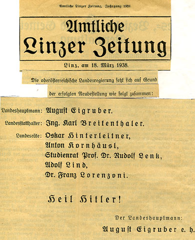 Zeitungsausschnitt rechts oben: Die Zusammensetzung der oberösterreichischen Landesregierung. "Amtliche Linzer Zeitung" vom 18. März 1938.