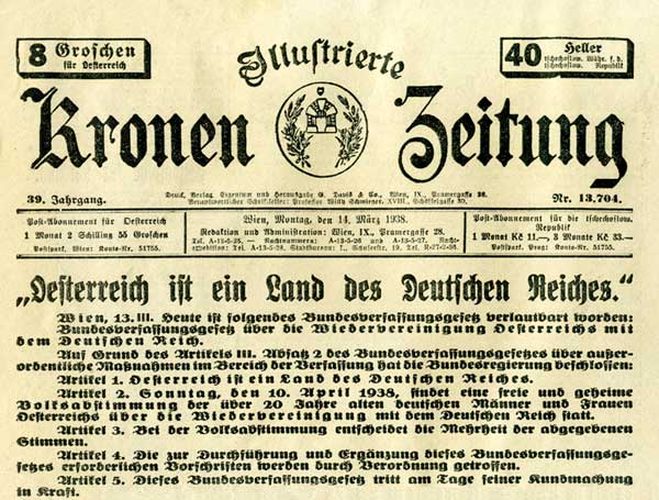 Zeitungsausschnitt rechts oben: "Illustrierte Kronen Zeitung" vom 14. März 1938: "Österreich ist ein Land des Deutschen Reiches." Das Gesetz über die "Wiedervereinigung" wird verlautbart.