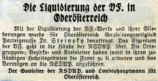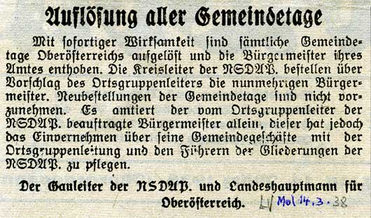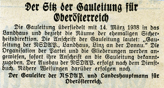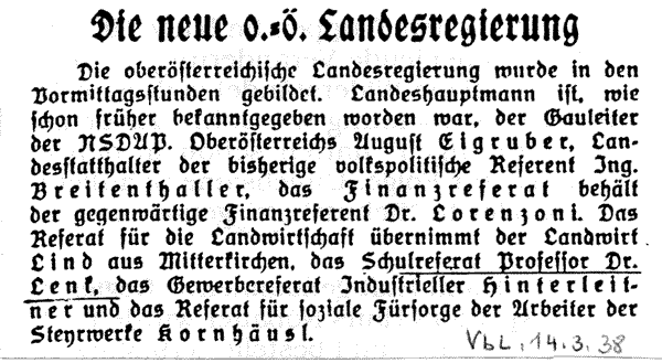 Rechts unten: "Linzer Volksblatt" vom 14. März 1938: "Die neue Oberösterreichische Landesregierung."